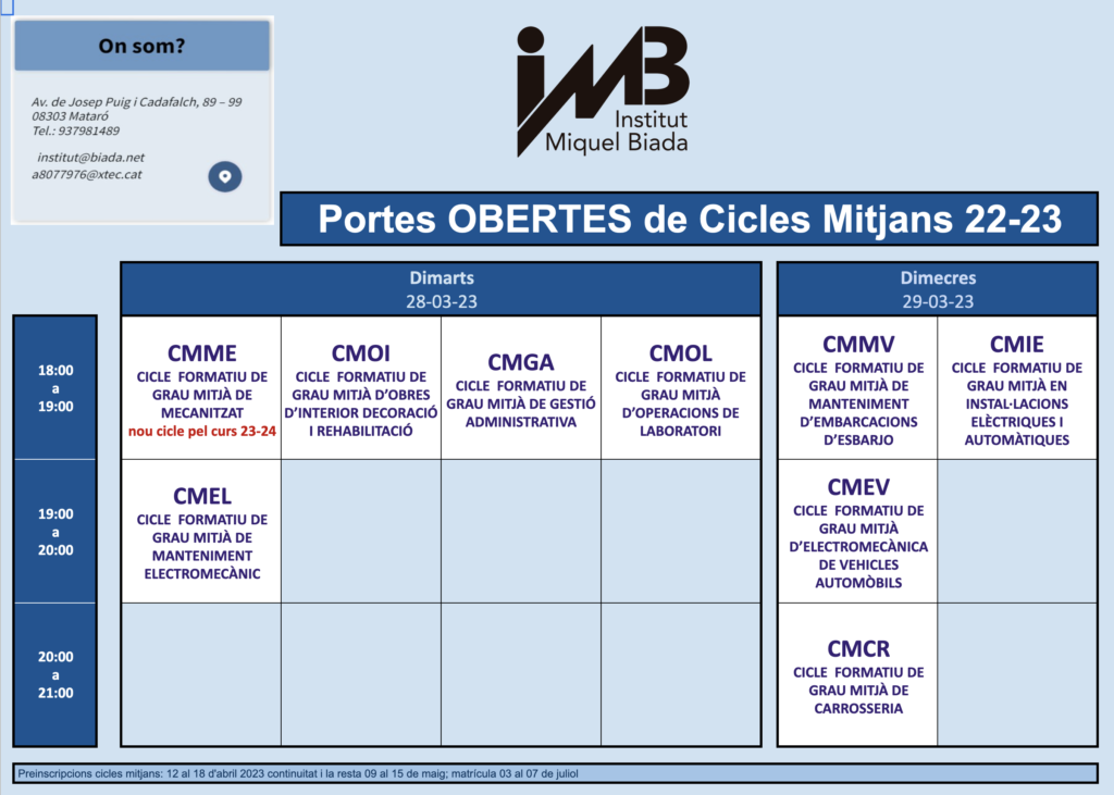 Aquest curs recuperem la presencialitat de les portes obertes dels Cicles de Grau Mitjà amb dos dies de visita, el 28 i el 29 de març de les 18 a les 21h.