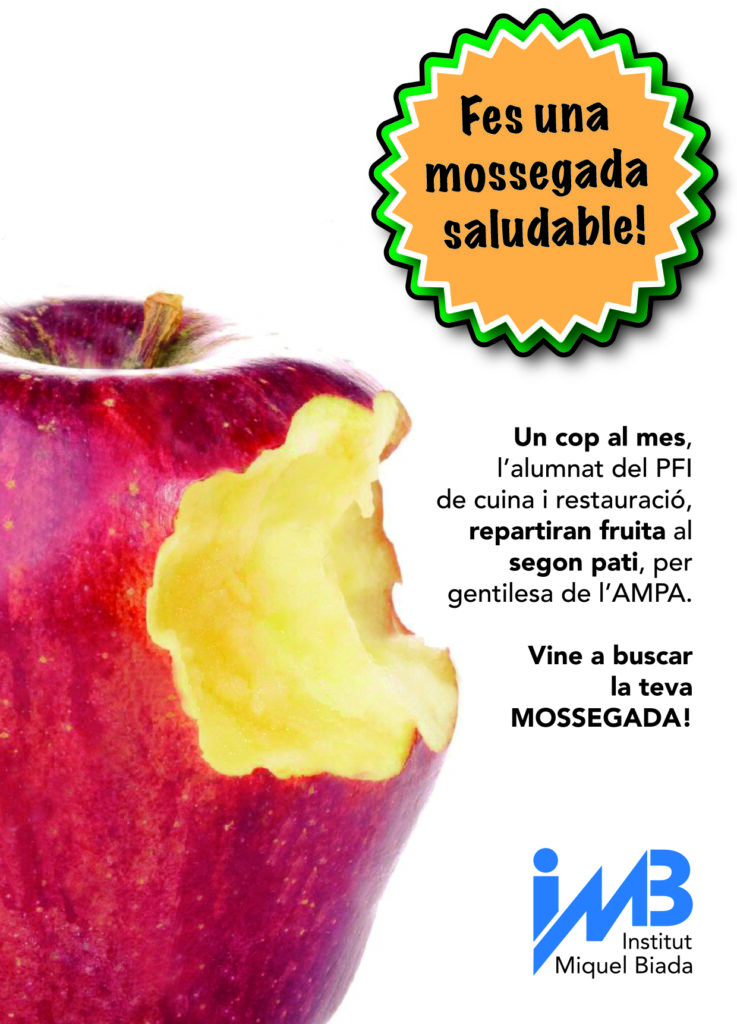 Aquest dijous l'alumnat del PFI de cuina i hoteleria amb la col·laboració de l'AMPA, iniciaran la campanya "Fes una mossegada saludable" que consisteix en repartir fruita a tot l'alumnat d'ESO durant el segon pati.