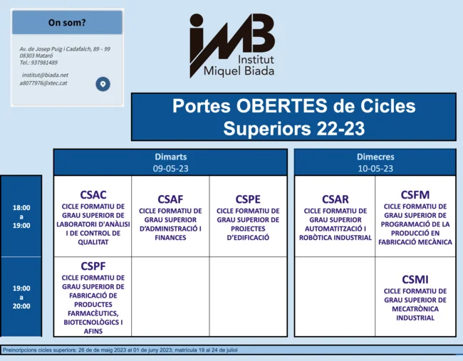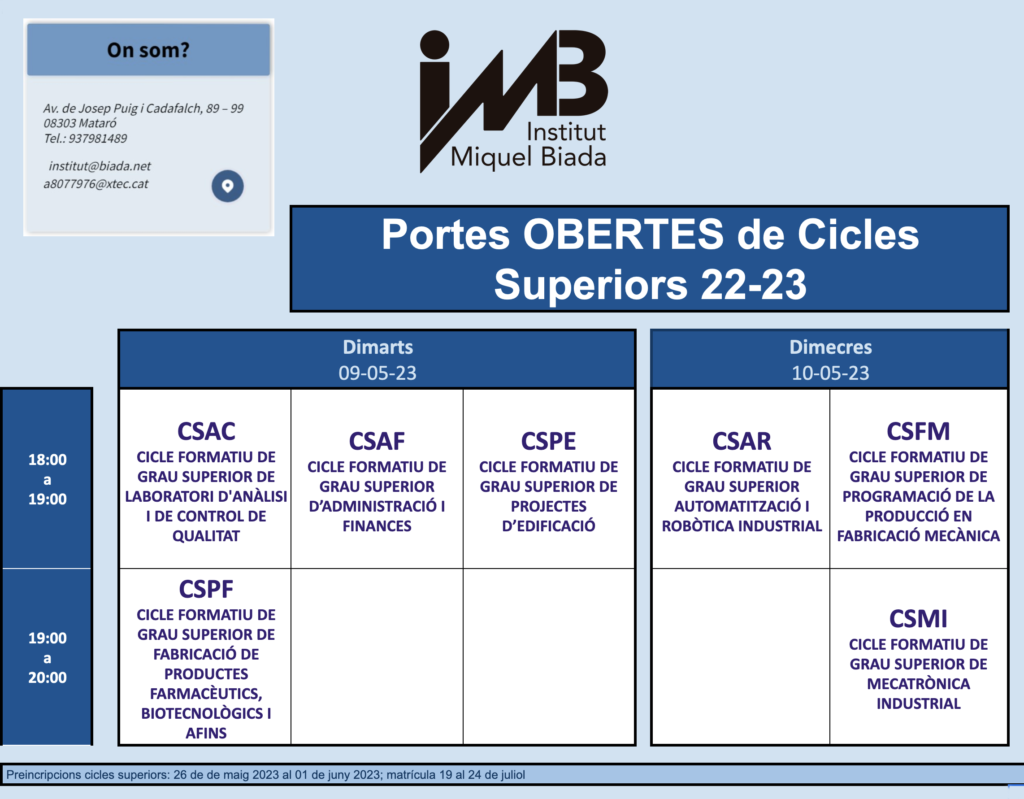 Aquest curs recuperem la presencialitat de les portes obertes dels Cicles de Grau Superior amb dos dies de visita, el 9 i el 10 de maig de les 18 a les 20h.