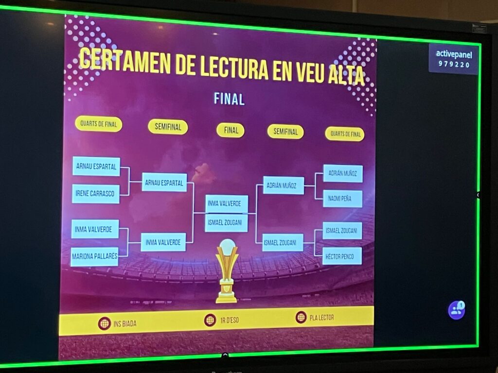 El passat divendres dia 16 de juny l’alumnat de 1r d’ ESO va participar en la gran final del certamen de lectura en veu alta de l'Institut. Una activitat que s’ha desenvolupat durant tres setmanes i consistia en millorar la lectura en veu alta que era un dels objectius a assolir dins del Pla Lector d’enguany. A la final van participar per votació del professorat i de l’alumnat els vuit finalistes d’entre els tres grups: Arnau Esparta, Irene Carrasco, Inma Valverde, Mariona Pallarès, Adriàn Muñoz, Naomi Peña, Ismael Zougani i Héctor Penco. Volem felicitar-los a tots ells i elles per la seva gran implicació i participació i per descomptat a la gran finalista que va ser l’Inma Valverde.
