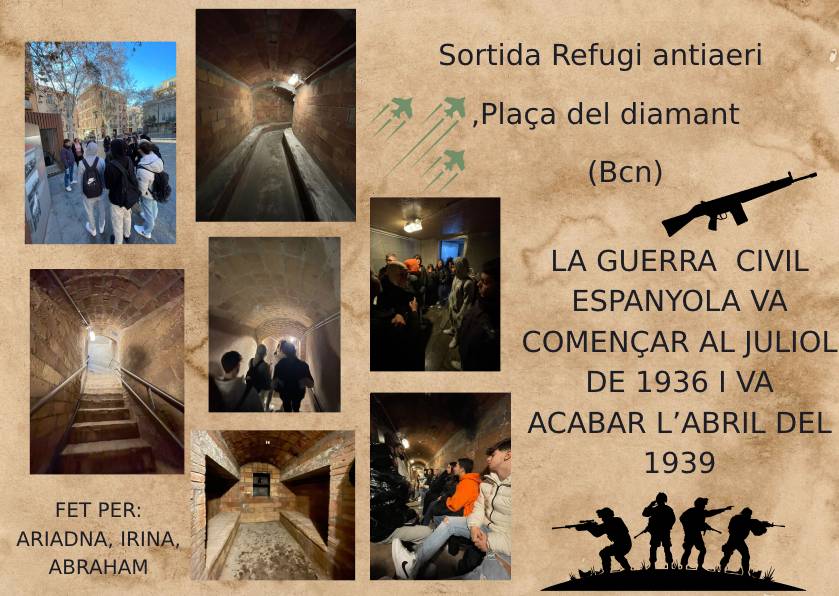 Després d’una llarga caminada, va començar la nostra aventura amb una petita introducció de com els barcelonins havien viscut els bombardejos de l’aviació italiana (amb base a Mallorca). Per fi va començar la visita, vam baixar per un passadís estret fins a 13 metres sota-terra, on ens van explicar moltes més coses. El que més ens va impactar i volem ressaltar és que dins d'aquests refugis no es podia fumar i que alguns temes estaven prohibits com la política, la religió i el futbol!, si t'ho saltaves et cridaven l'atenció i si et posaves a la defensiva... cap a fora!.