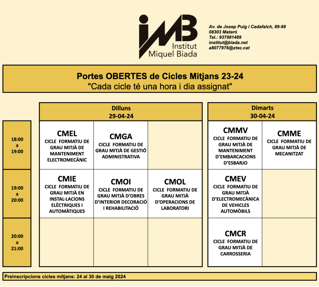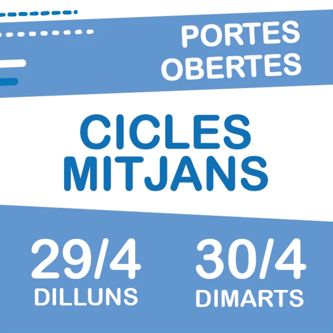 Les portes obertes consistiran en una presentació per part de direcció i cap d'estudis i després el responsable del cicle formatiu us farà una xerrada específica (continguts, accés, sortides professionals, etc.) i posteriorment una visita a les instal·lacions. No cal cita prèvia. Us hi esperem!
