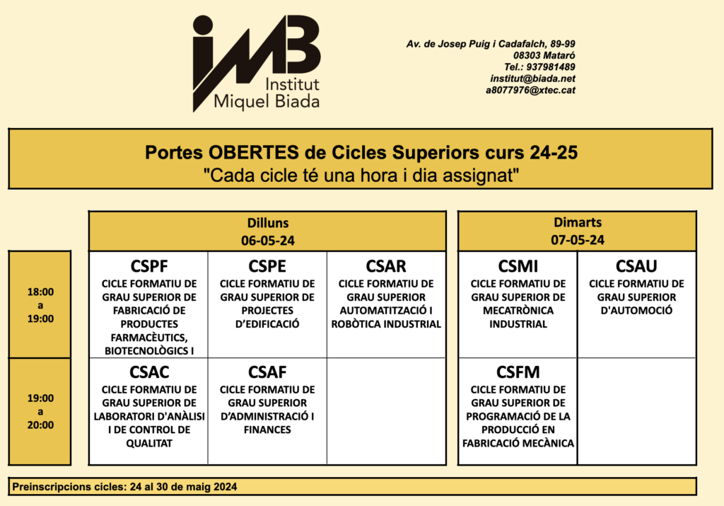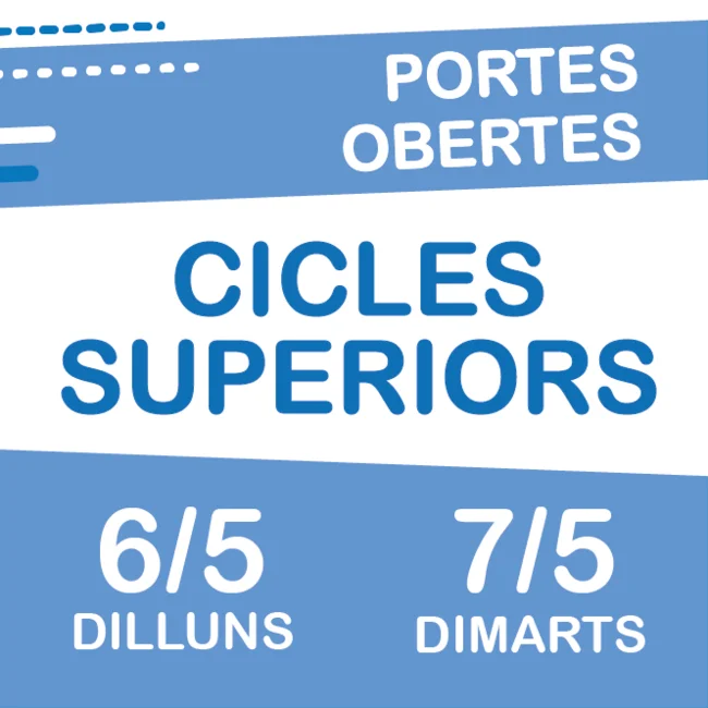 Les portes obertes consistiran en una presentació per part de direcció i cap d'estudis i després el responsable del cicle formatiu us farà una xerrada específica (continguts, accés, sortides professionals, etc.) i posteriorment una visita a les instal·lacions.