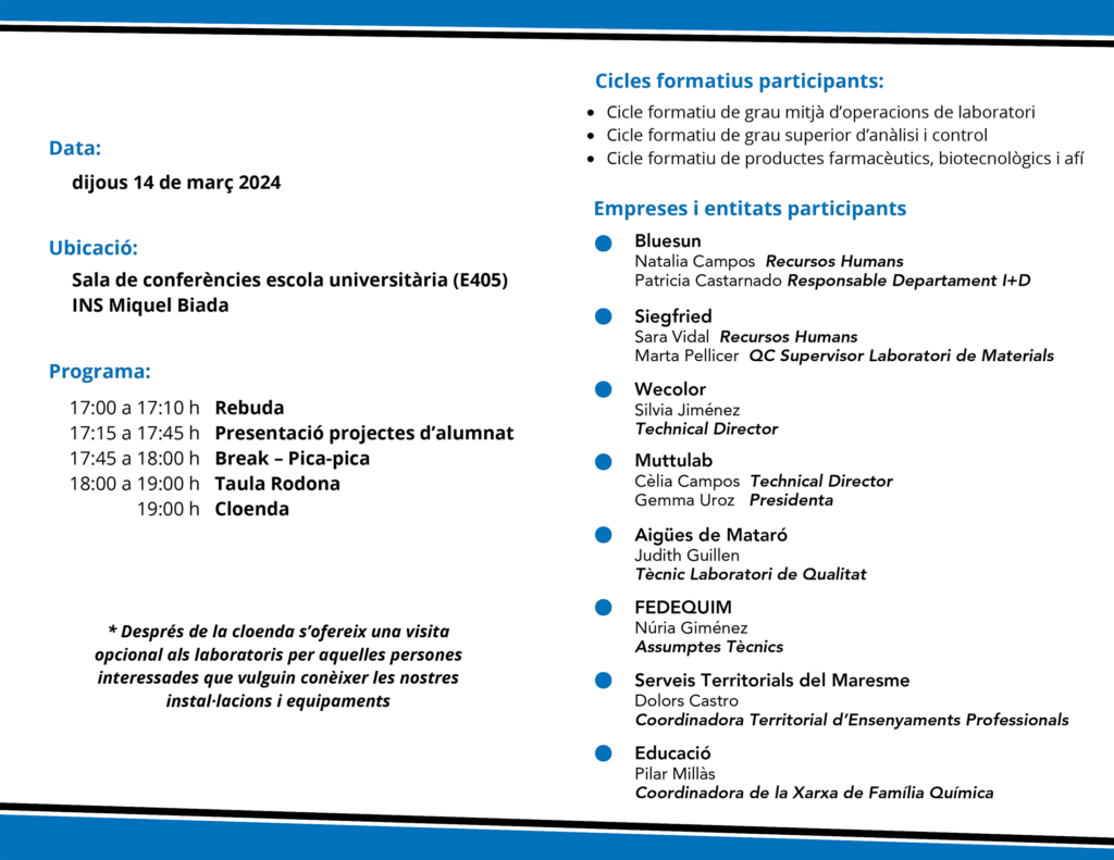 Aquesta jornada tindrà dues parts. En una primera part, els alumnes dels cicles de química exposaran, davant de representants d'una sèrie d’empreses del sector, diferents projectes que han realitzat en els mòduls professionals: Tractament d’aigües residuals, control de qualitat pinsos i síntesi de principis actius farmacèutics. Posteriorment es procedirà a realitzar una taula rodona on els representants de les empreses exposaran les seves experiències relacionades amb el món de la FP i els alumnes de FP intervindran amb diferents qüestions.