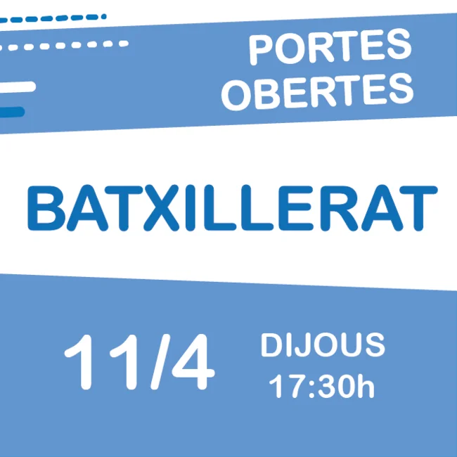 Les portes obertes de Batxillerat seran dijous 11 d'abril a les 17:30 h. La jornada consistirà en l'explicació del nostre projecte educatiu per Batxillerat i un breu recorregut per les instal·lacions. No cal cita prèvia. Us hi esperem!