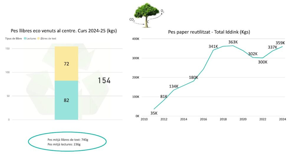 El programa de reutilització de llibres de text d'ESO i Batxillerat ens ha permès un estalvi de 154 kg de paper. Aquest fet ha comportat un estalvi total en llibres per aquestes famílies de 5.103 euros. Gràcies a les 416 famílies que ho han fet possible i a l'organització d'Iddink que ens ajuda amb tota la infraestructura.