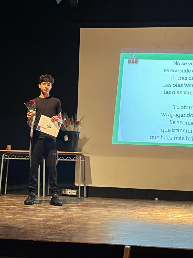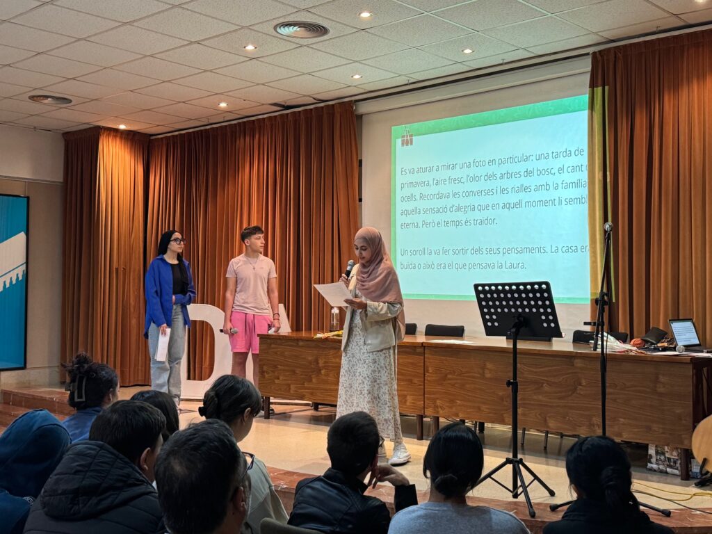 1r i 2n de batxillerat (categories F i G) va participar en el seu certamen amb obres de temàtica i gènere lliure i, a banda de llegir les obres premiades, també hi va haver espai perquè alguns alumnes o professors interpretessin algunes peces musicals en directe. Un dels moments més emotius que es va viure va ser quan els alumnes de 2n de batxillerat, Iker Carmona i Hada Vázquez, van fer una versió íntima de ‘La gent que estimo’, d’Oques Grasses, acompanyats del professor Jordi Vadell a la guitarra.