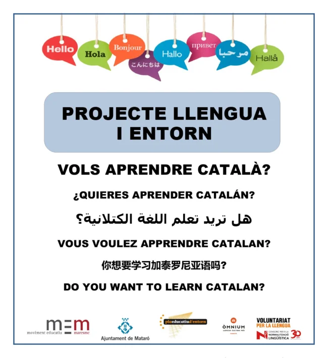Conjuntament amb Òmnium i el Servei d’Igualtat i Ciutadania de l’Ajuntament de Mataró, continuem amb el Projecte Llengua i Entorn, que cada curs creix més. L’objectiu principal del projecte és realitzar sessions de català oral i escrit al llarg del curs escolar.