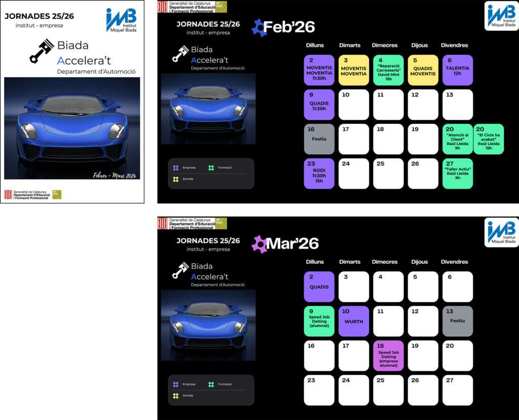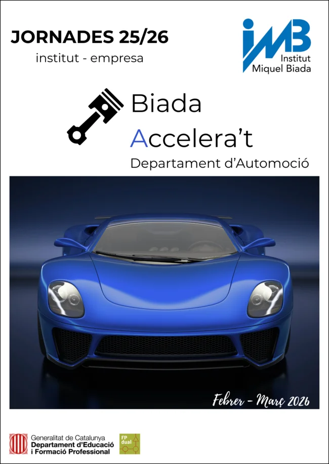 Durant els mesos de febrer i març de 2026, el Departament d’Automoció de l’Institut Miquel Biada organitza Biada Accelera’t, unes jornades institut–empresa amb un complet calendari d’activitats que inclou xerrades, visites i accions formatives amb empreses i professionals del sector.