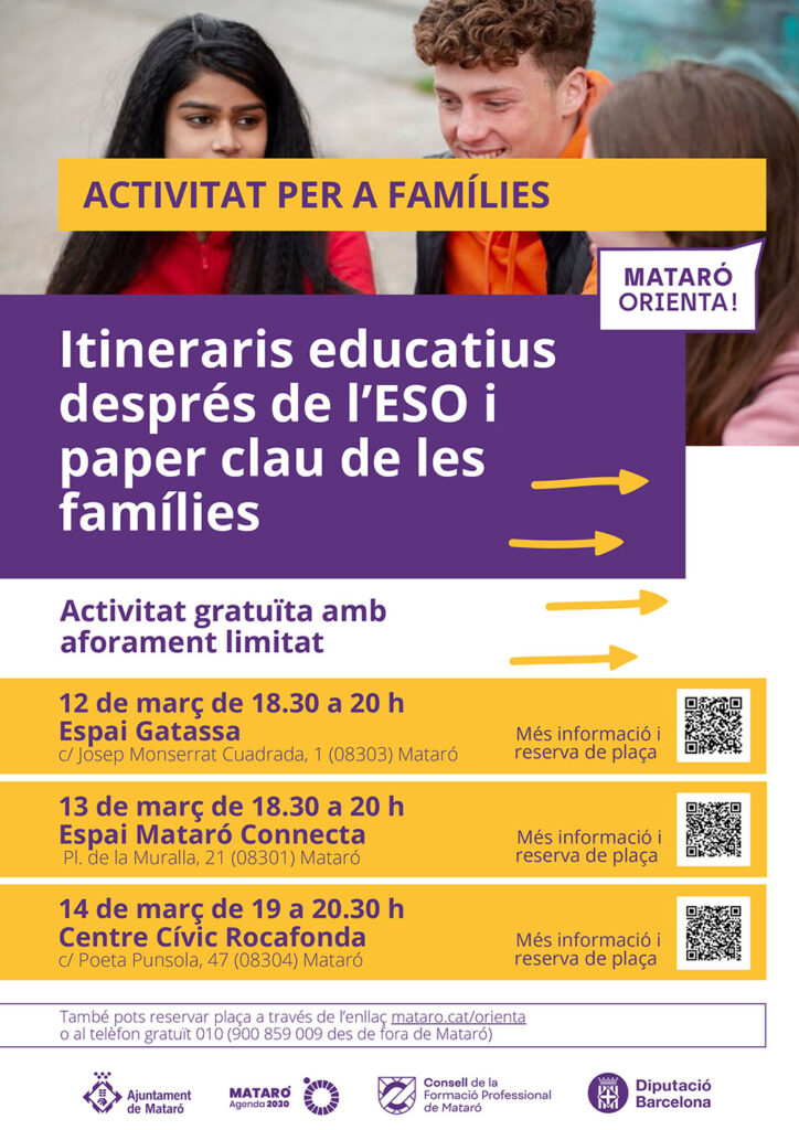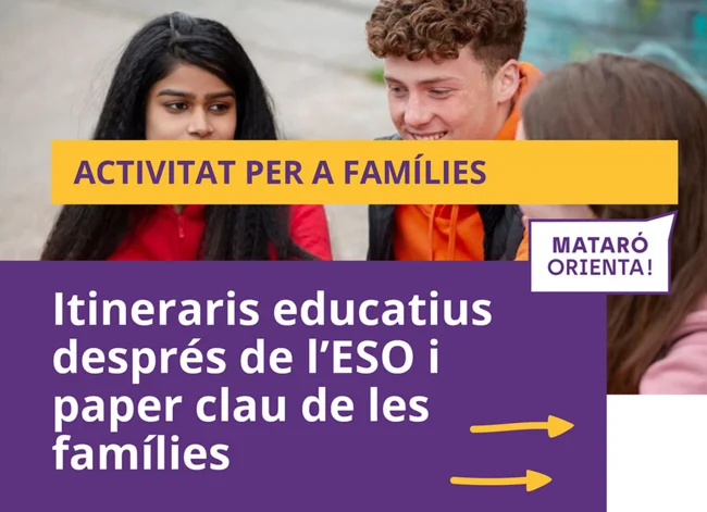 Des de l’Equip Mataró Orienta ens informen d’una activitat adreçada a famílies per conèixer els diferents itineraris educatius que es poden seguir després de l’ESO, així com per oferir eines que ajudin a acompanyar els fills i filles en la presa de decisions acadèmiques.