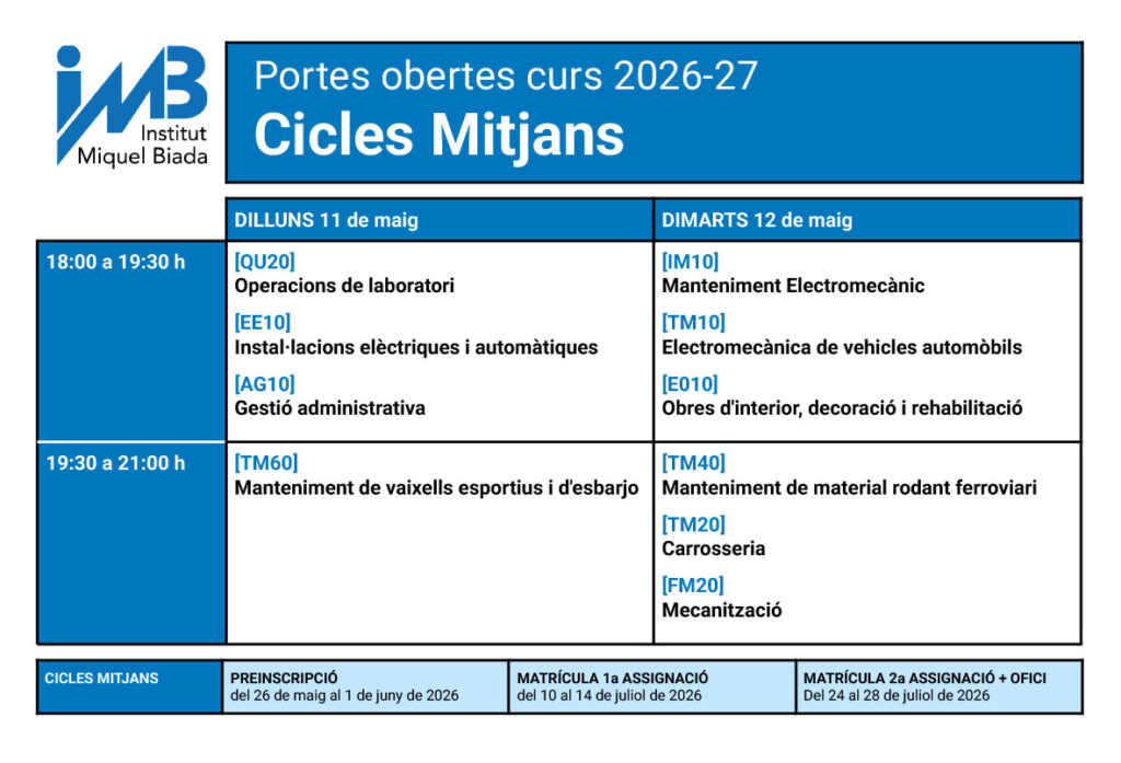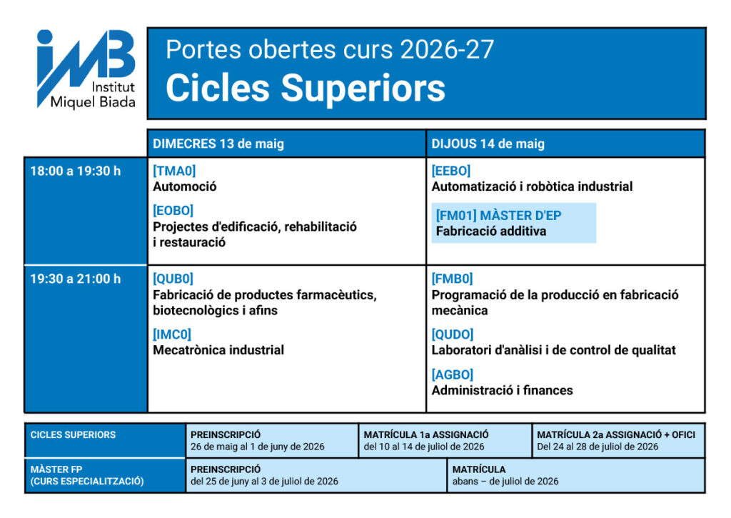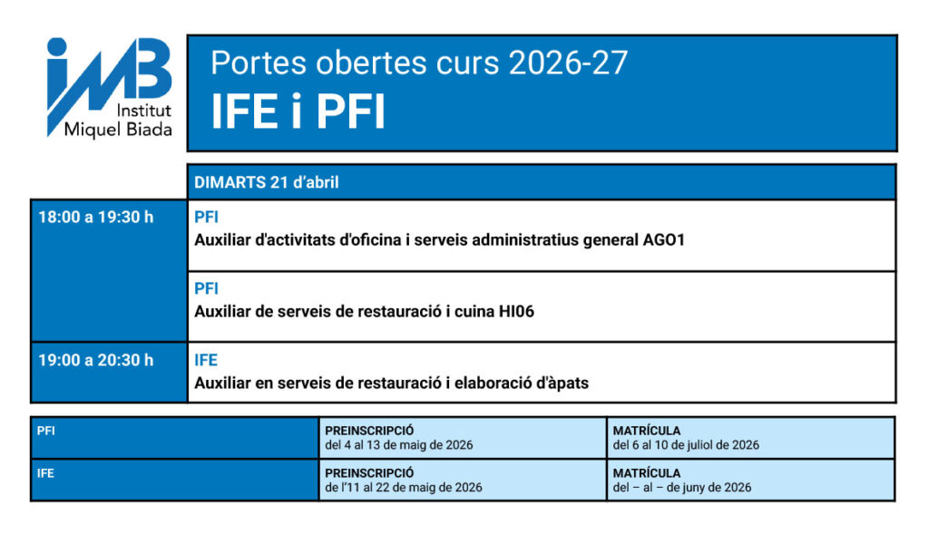 Si estàs pensant a formar-te en l’àmbit industrial, de la construcció, químic o administratiu i vols conèixer millor la nostra oferta formativa —cicles formatius de grau mitjà i de grau superior, PFI, IFE o curs d’especialització—, t’esperem a les sessions informatives de l’Institut Miquel Biada.