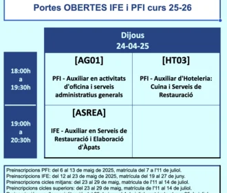 Tot seguit trobareu les dates i horari de les portes obertes que organitzem per mostrar-vos tota l'oferta de l'INS Miquel Biada de formació professional: PFI, IFE, curs d'especialització i cicles formatius....