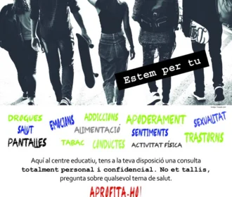 A partir de divendres 30/09, de 9 a 10 h, tornarà a venir al nostre centre la infermera del programa Salut i Escola. Un servei que pretén, de manera anònima, ajudar i assessorar a tot l’alumnat que estigui interessat o interessada en fer una consulta sobre temes molt diversos, com l’alimentació, la salut mental, la sexualitat, etc....